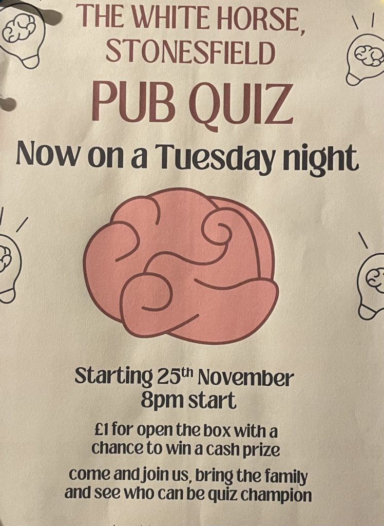 Quiz night will now be on Tuesdays, alternating between Sports and Social Club and The White Horse. Tuesday 25 November will be the first one at The White Horse. It all kicks off at 8pm. No booking required.