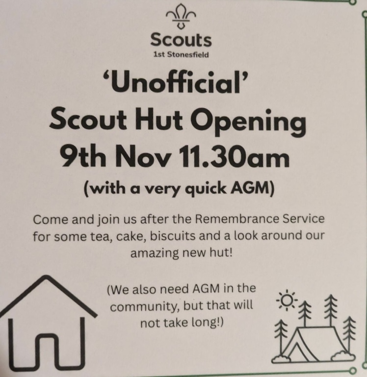 Scout Hut opening: 9 Nov Oct 27, 2025 | Stonesfield news, What's on Screenshot Unofficial opening of the new Scout Hut at 11.30 on 9 November. Tea, cake and biscuits.