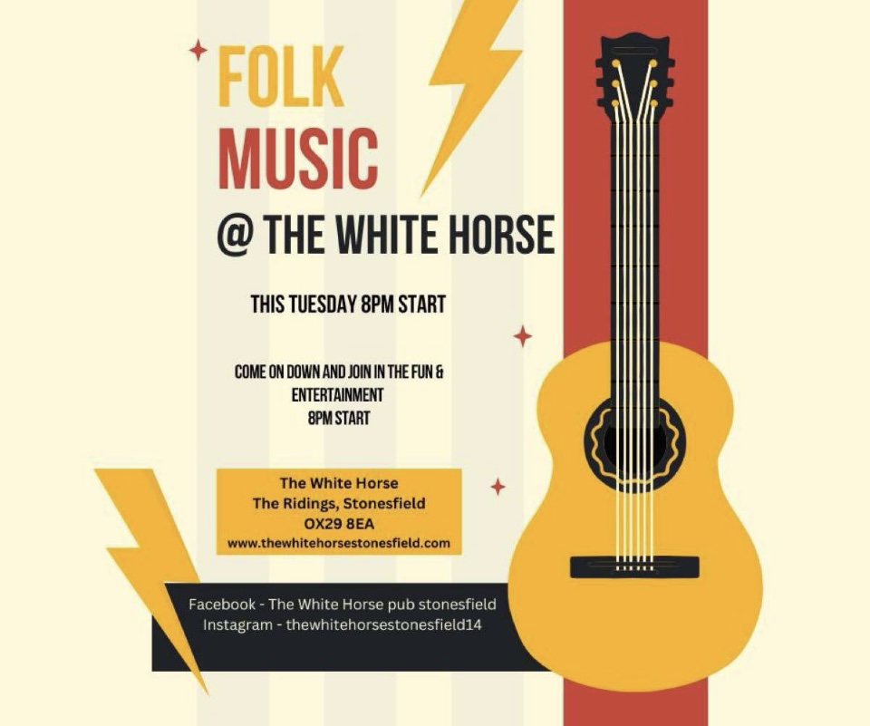 White Horse Folk will be on Tuesday 21 October at 7.30 for 8pm at The White Horse.